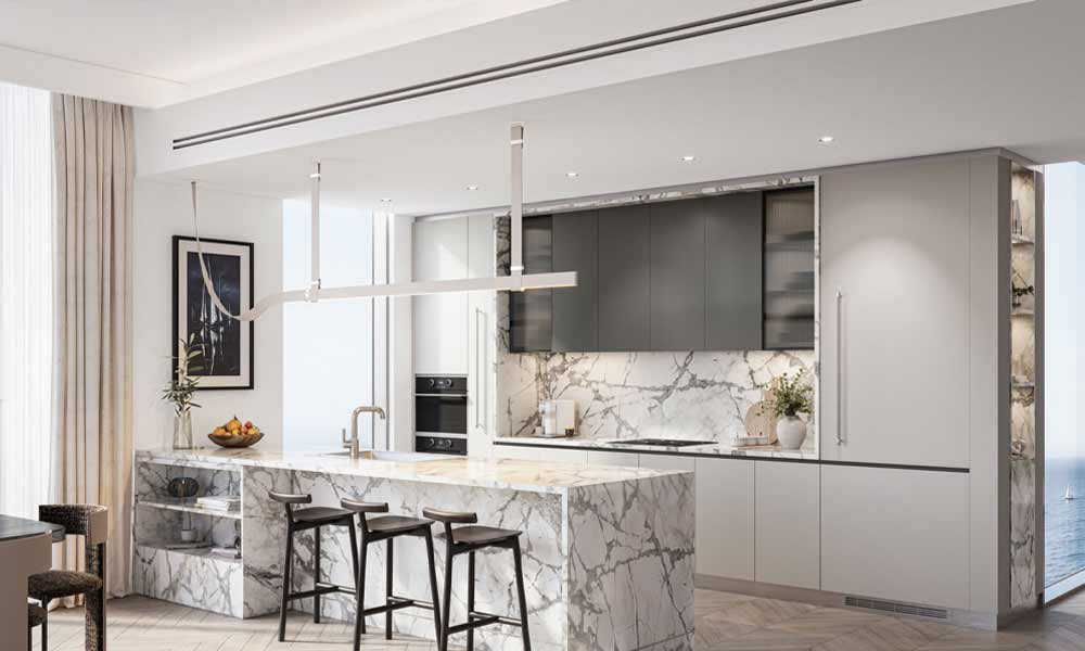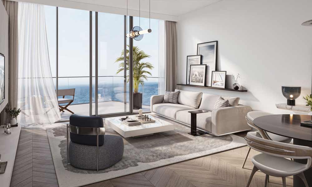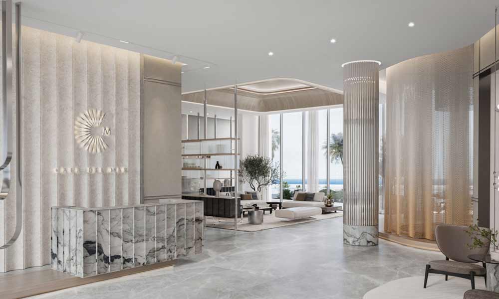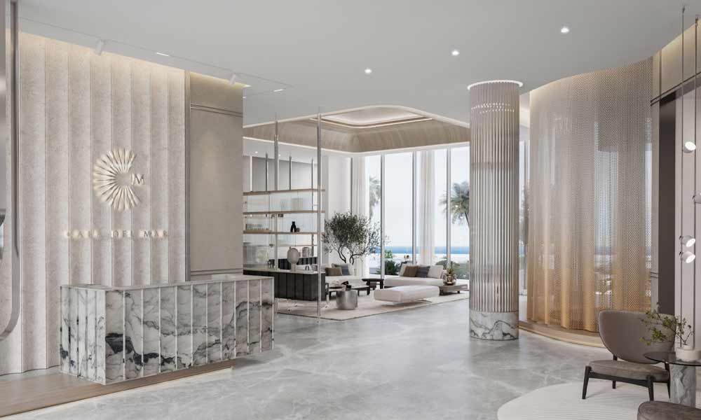 At Cala Del Mar, you can choose from premium studios, 1, 2, 3, and 4-bedroom apartments, exquisitely designed to cater to various lifestyles. Each unit offers unhindered views of the Arabian Gulf, allowing residents to bask in the tranquility of ocean-front living. The opulent lobby, featuring grand marble flooring and floor-to-ceiling windows, sets a distinguished tone for luxury living. Cala Del Mar, located on the pristine Marjan Island in Ras Al Khaimah, is an exquisite residential project developed by Ellington Properties. The architectural elegance and the design ethos draw inspiration from the fluidity of the ocean, presenting motifs reminiscent of luxurious yachts and coral-shaped moorings.
