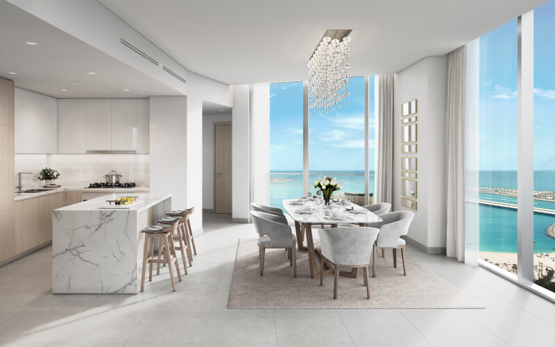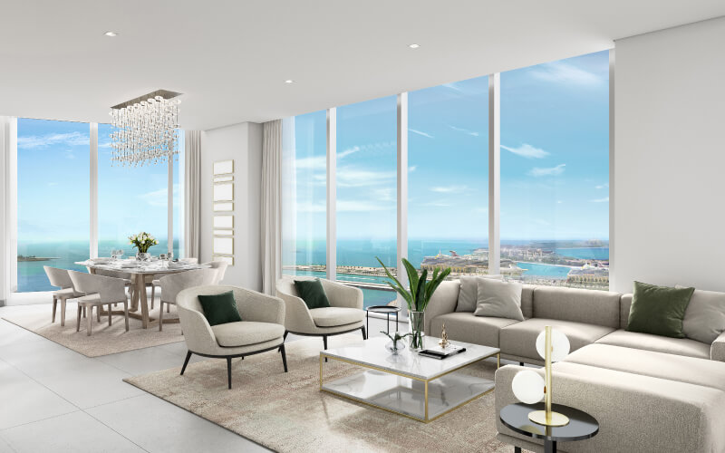 Fantastic studios, 1 – 3 bedroom apartments and penthouses, Starting at AED 1.029M, Handover: May 2025, Pay 50% during construction and 50% on handover, High ROI generating product, Finest quality finishing and spacious homes, Stunning views of the Marina, sea and The Palm