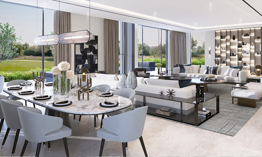 Private and Convenient Access: Each Signature Mansions villa has its own private, shaded lower ground level parking, ensuring a seamless journey into your home., Spacious Living Areas: The villas offer expansive living spaces filled with natural light, enhancing the broad and flexible indoor and outdoor entertainment areas., Attention to Detail: Meticulous planning, a focus on quality, and vibrant interiors of contemporary sophistication define each villa., Community Hub: The heart of Jumeirah Golf Estates is the 12,150 square meter Clubhouse, featuring the finest sports, dining, and leisure facilities, just steps away from Signature Mansions., Exclusive Collection: Signature Mansions is an exclusive collection of modern luxury villas, offering unparalleled views of the Fire golf course, the Dubai skyline, or the lush natural community below., Desirable Address: Positioned as the most desirable address within Jumeirah Golf Estates, each villa is a unique, eye-catching residence., Panoramic Views: Enjoy unmatched panoramic views of the 400-meter wide golf course, with horizon vistas accessible from sunrise to sunset.