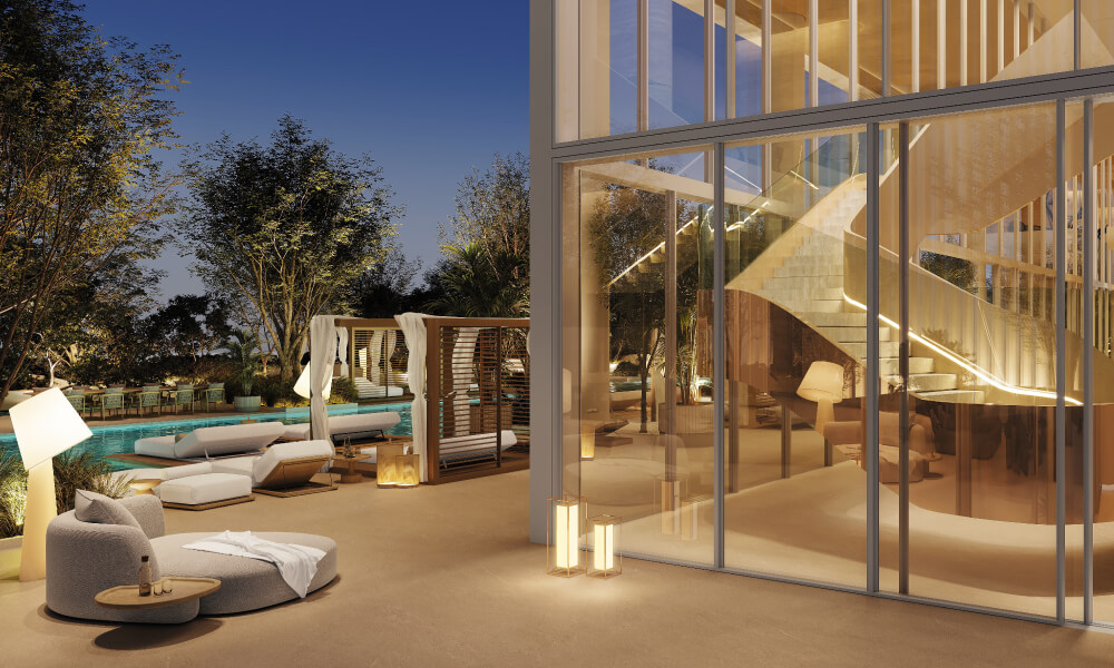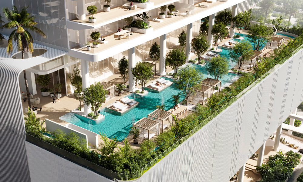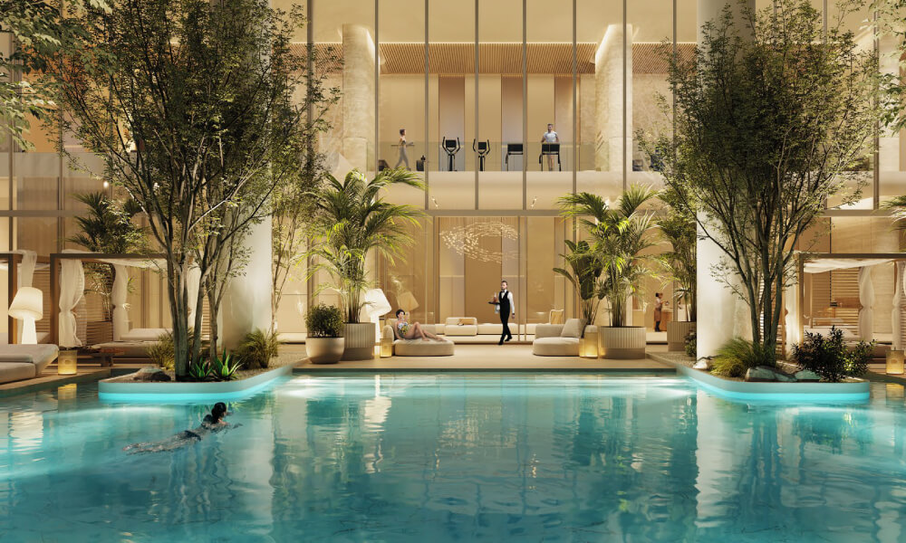 Exclusive Branded Living – Fully equipped branded and serviced residences designed for refined, hassle-free luxury living., Unrivaled Location – Situated on Sheikh Zayed Road, offering seamless connectivity to Dubai’s prime business and leisure hubs., Exceptional Interiors – Featuring Italian-designed social kitchens by Pedini, Miele appliances, and elegant travertine finishes for timeless sophistication., World-Class Amenities – Residents enjoy a lagoon-inspired pool, infinity pool, private cinema, health club, and Omakase Dining.
